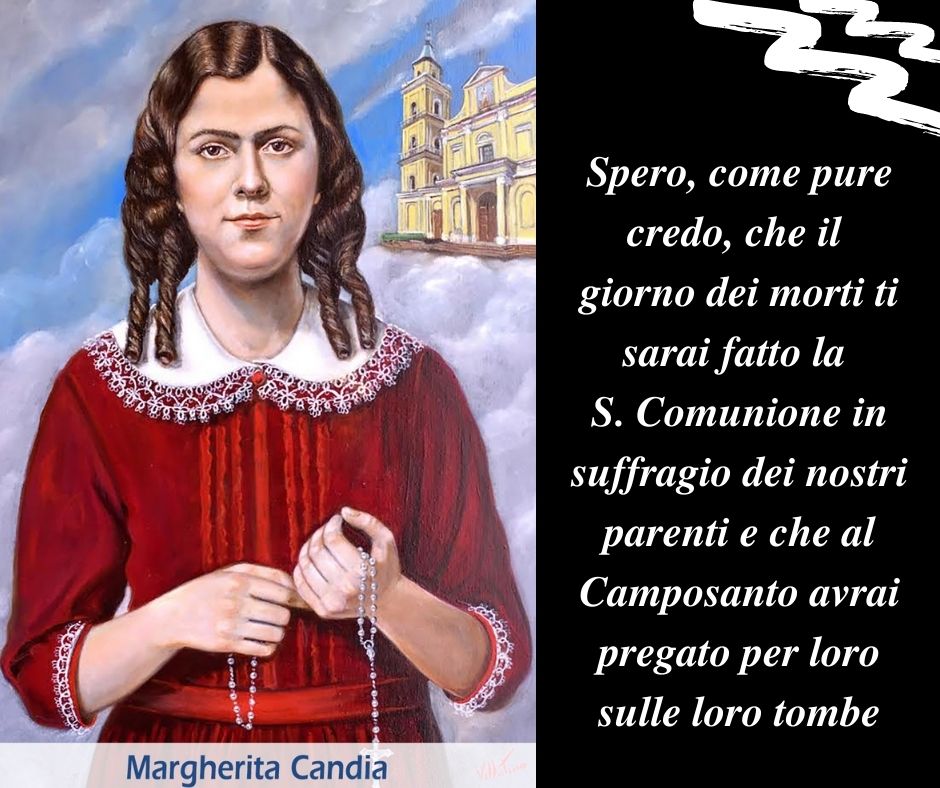 Margherita chiede, nella ricorrenza del 2 novembre, di pregare per i defunti. Consiglia di farlo prima partecipando alla Santa Messa e accostandosi all’altare per ricevere l’Eucaristia, poi, di pregare al camposanto sulle loro tombe. In altri scritti Margherita chiede di pregare anche per i sacerdoti defunti e per coloro che sono dimenticati perchè non hanno più cari. D’altronde, lo ricordiamo, pregare Dio per i vivi e i morti è l’ultima delle sette opere di misericordia spirituale. Preghiamo!